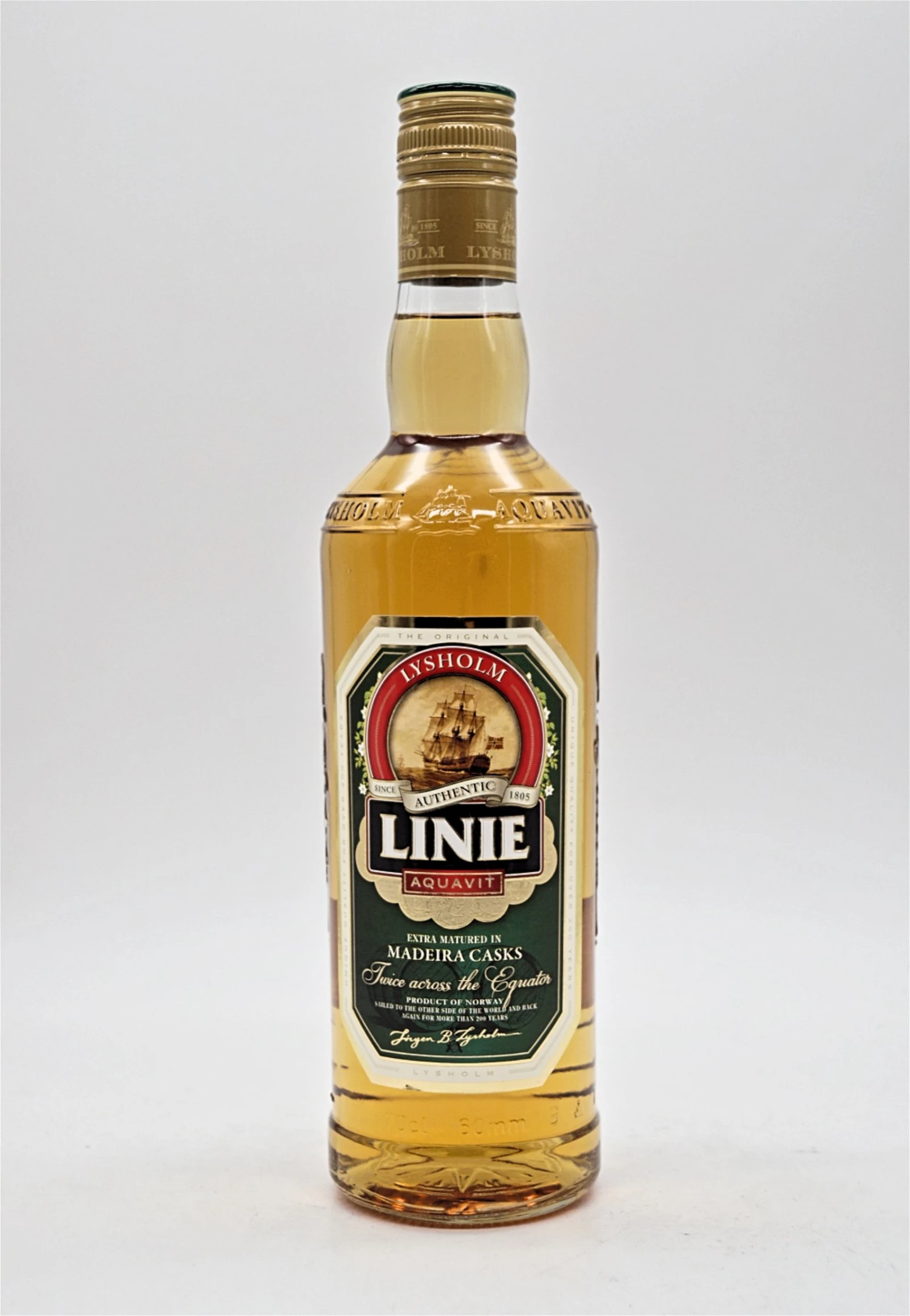 Das Geheimnis seines Geschmacks ist die Reifung in Fässern auf hoher See. Seit 1807 reist jeder Tropfen Linie für seinen vollendeten Genuss vier Monate bis ans Ende der Welt und wieder zurück. Zweimal überquert er dafür den Äquator, die „Linie“ in der Sprache seiner norwegischen Heimat. Die Dünung dreier Weltmeere, der Wechsel zwischen verschiedenen Klimazonen und die salzhaltige Luft bieten die perfekten Bedingungen, seine Aromen in alten Sherry-Fässern zu entfalten.